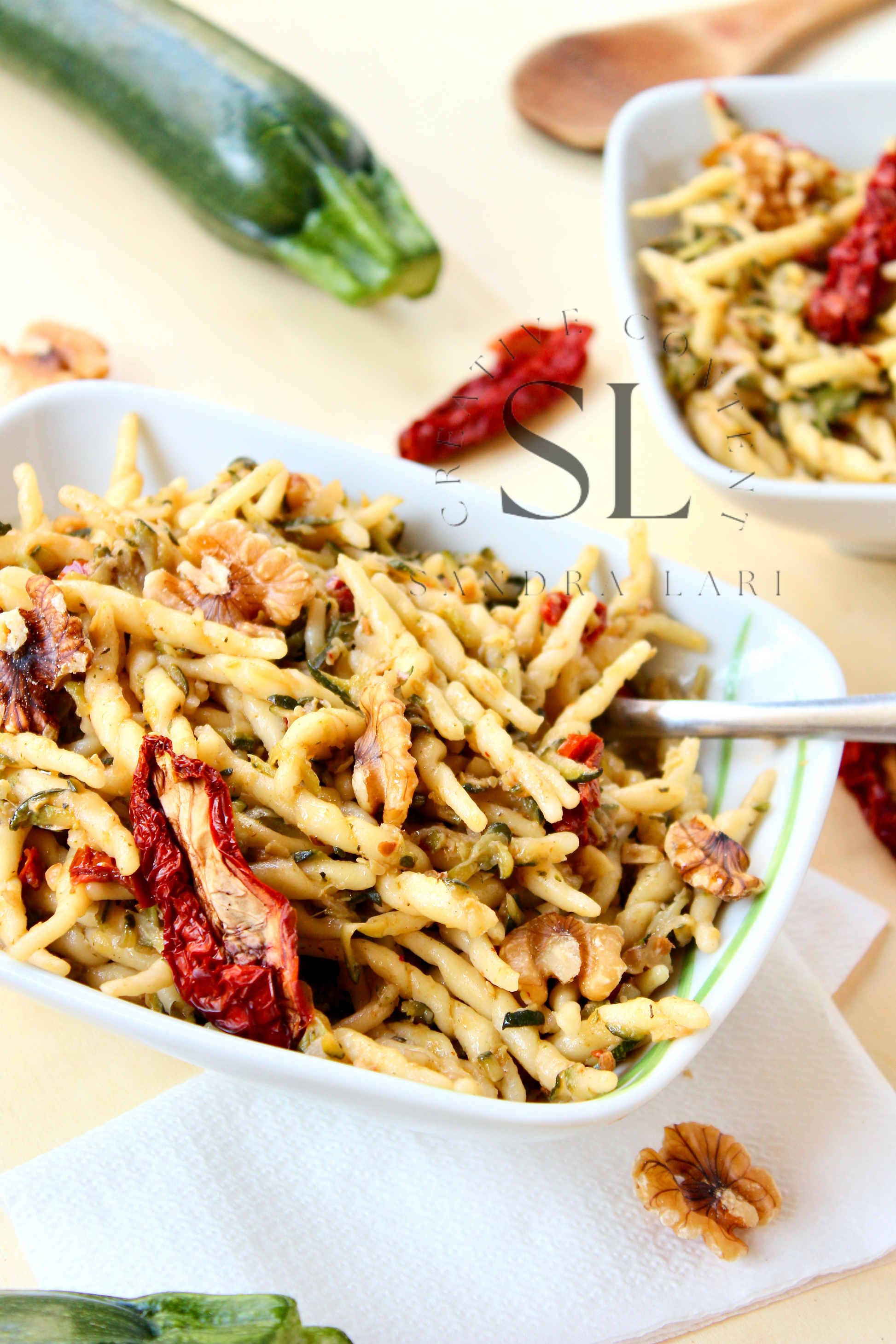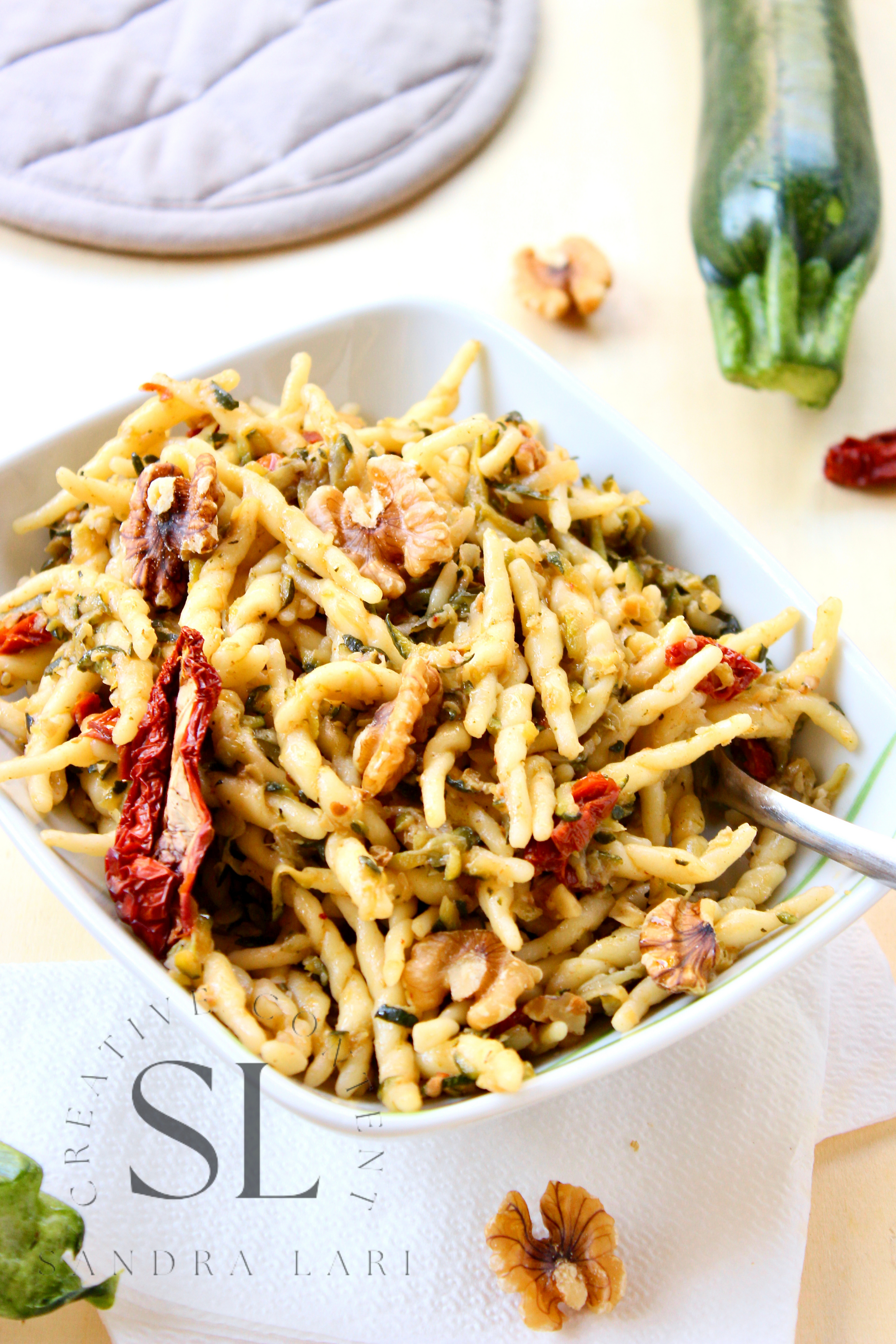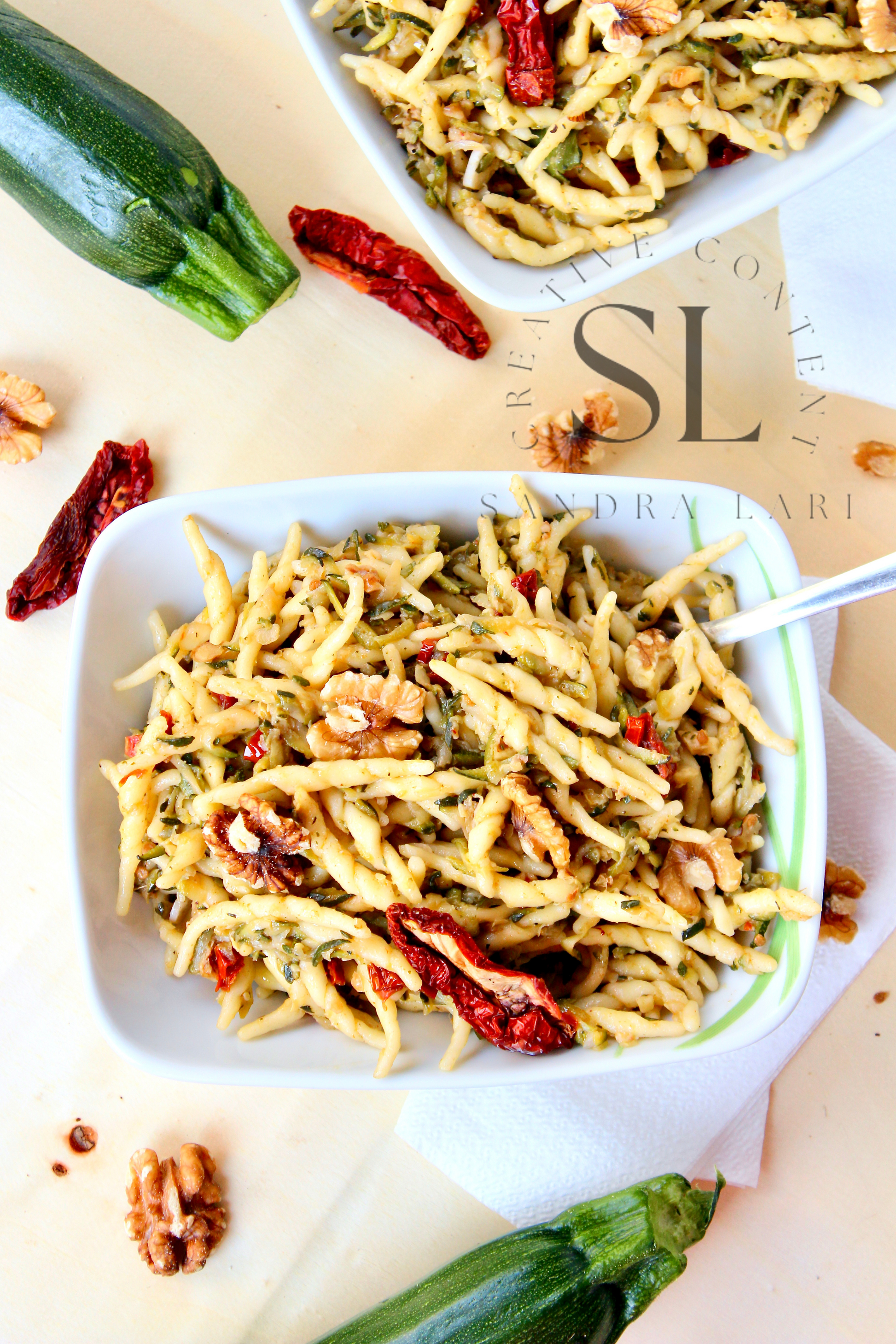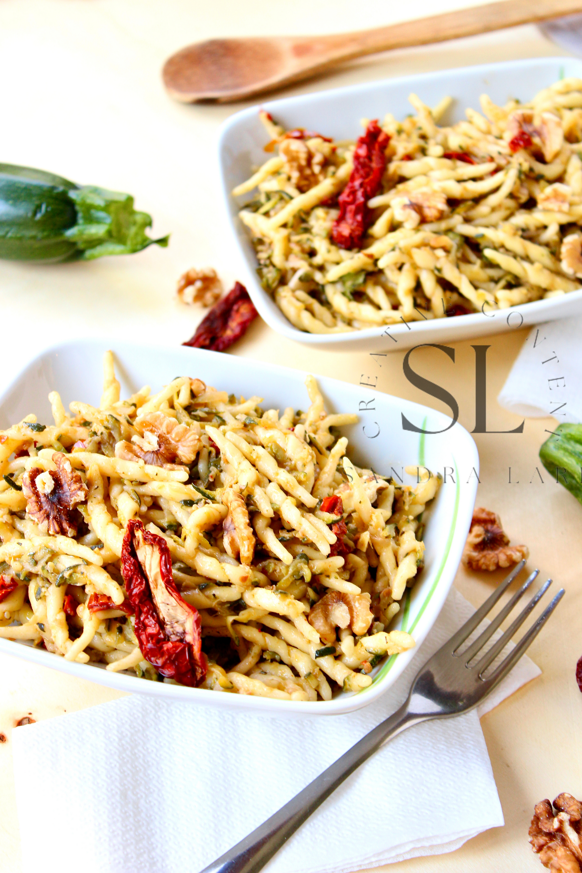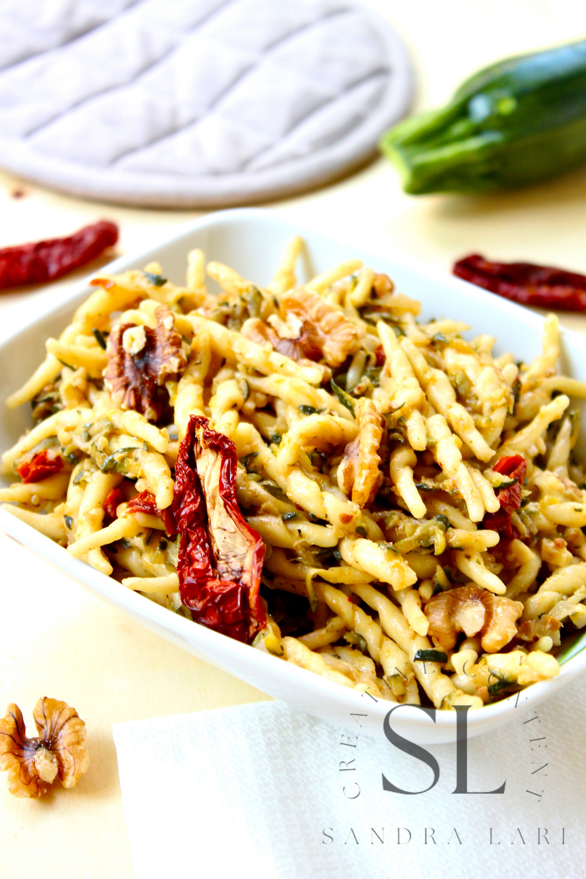 Featured Ingredients: dry pasta, dry tomatoes, zucchini, garlic cloves, walnuts, olive oil, salt and black pepper (+ optional: oregano).