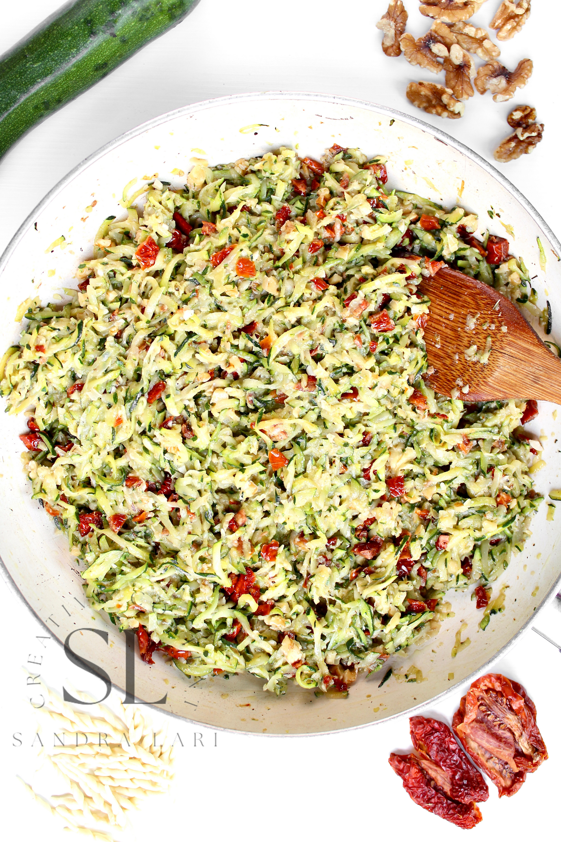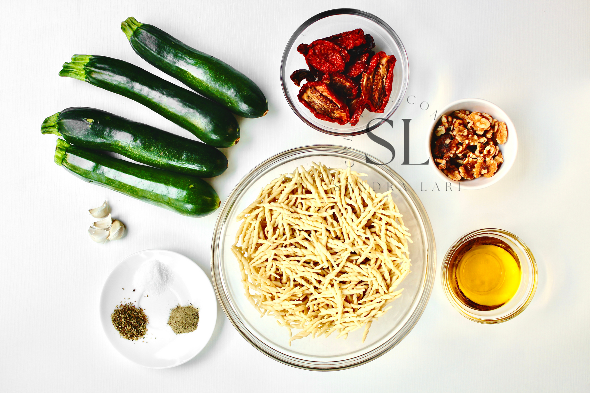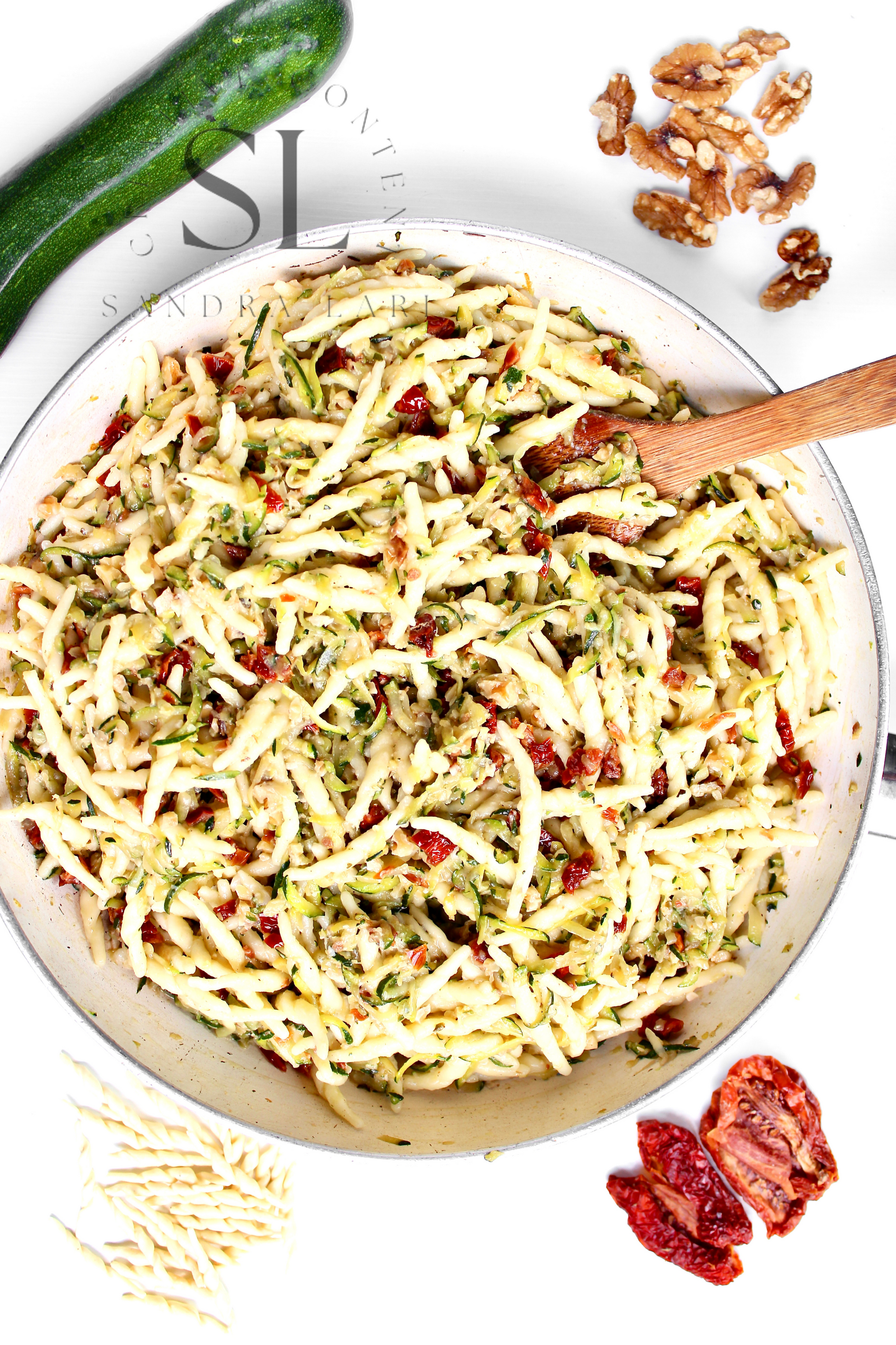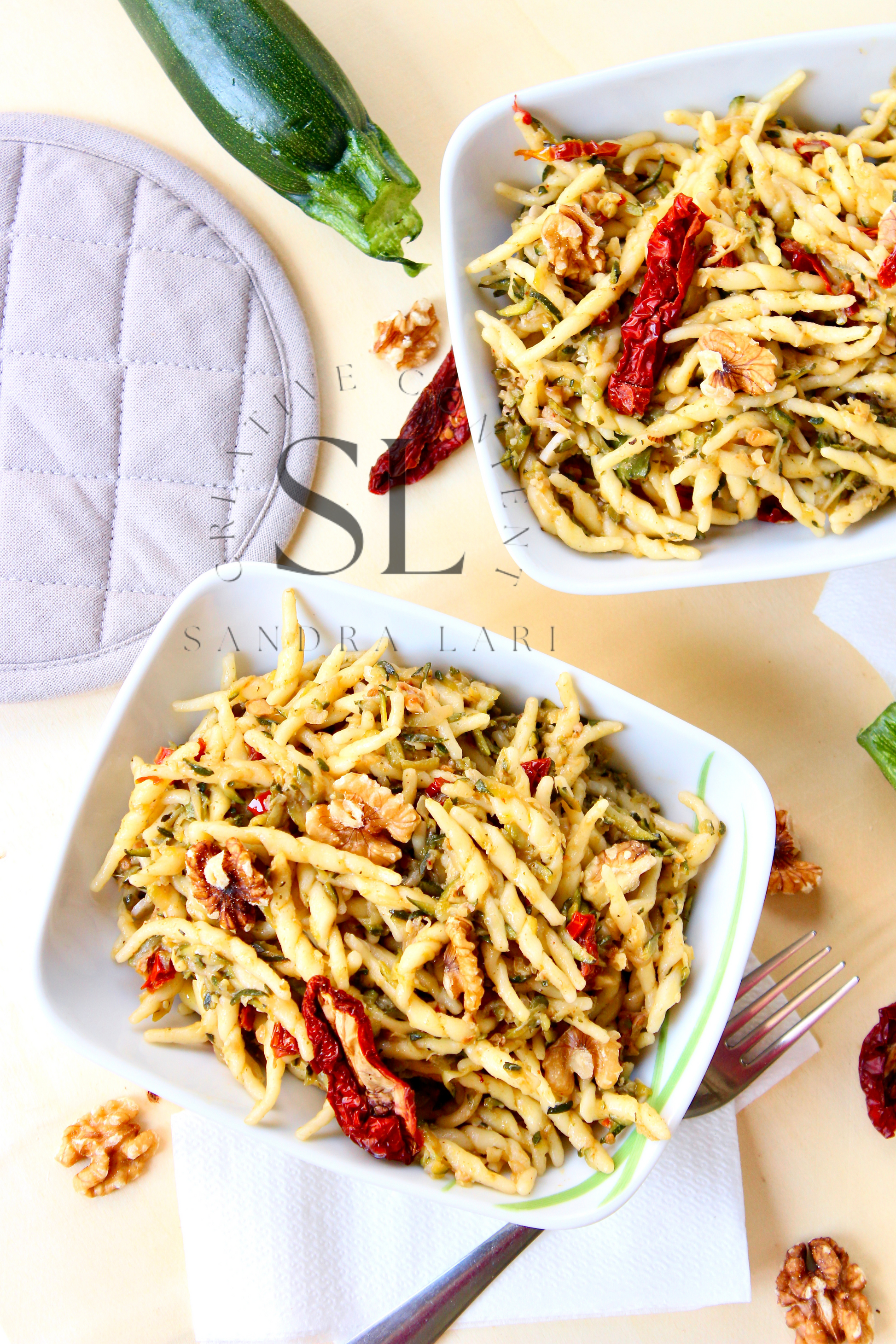 Featured Ingredients: dry pasta, dry tomatoes, zucchini, garlic cloves, walnuts, olive oil, salt and black pepper (+ optional: oregano).