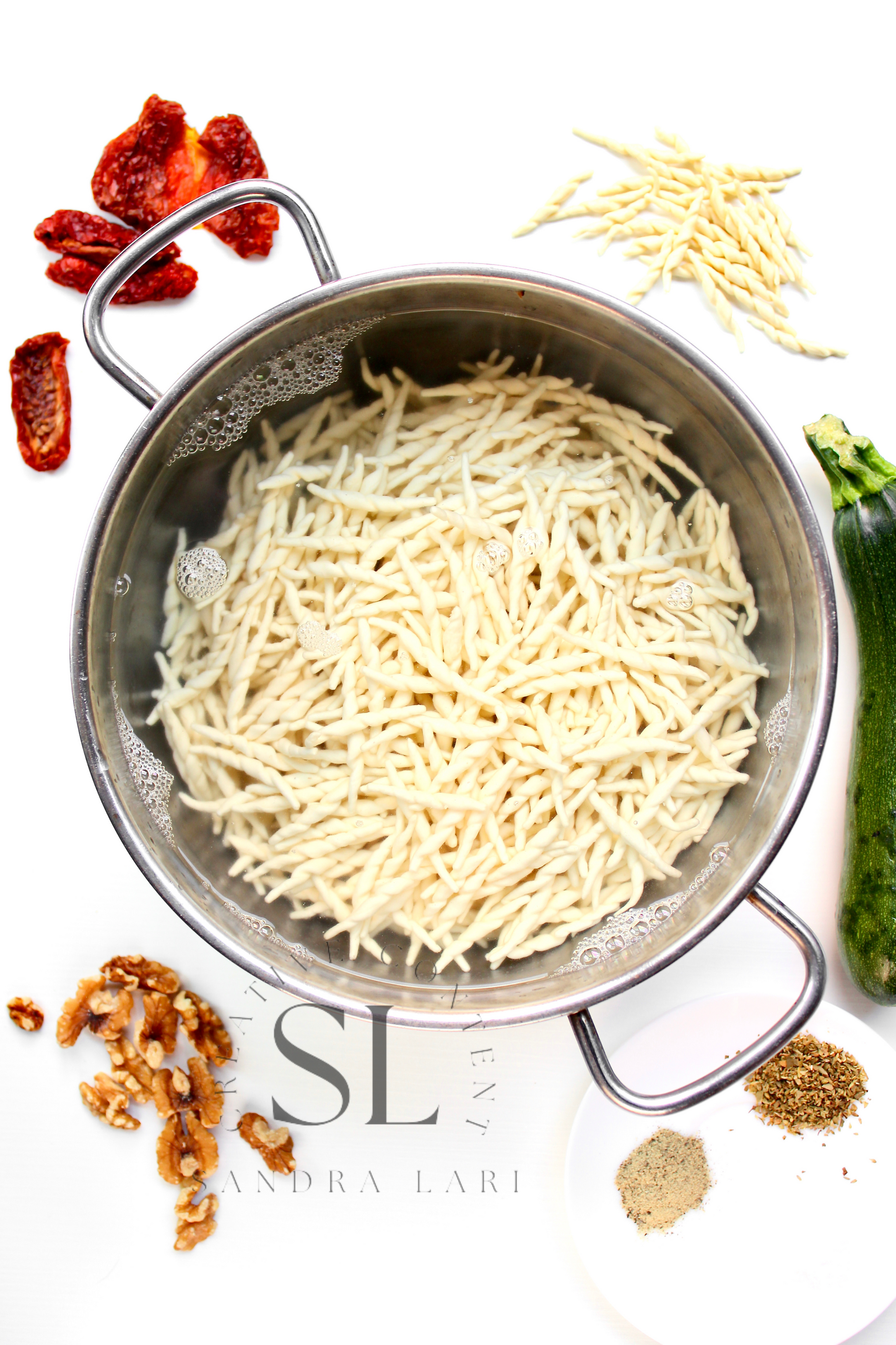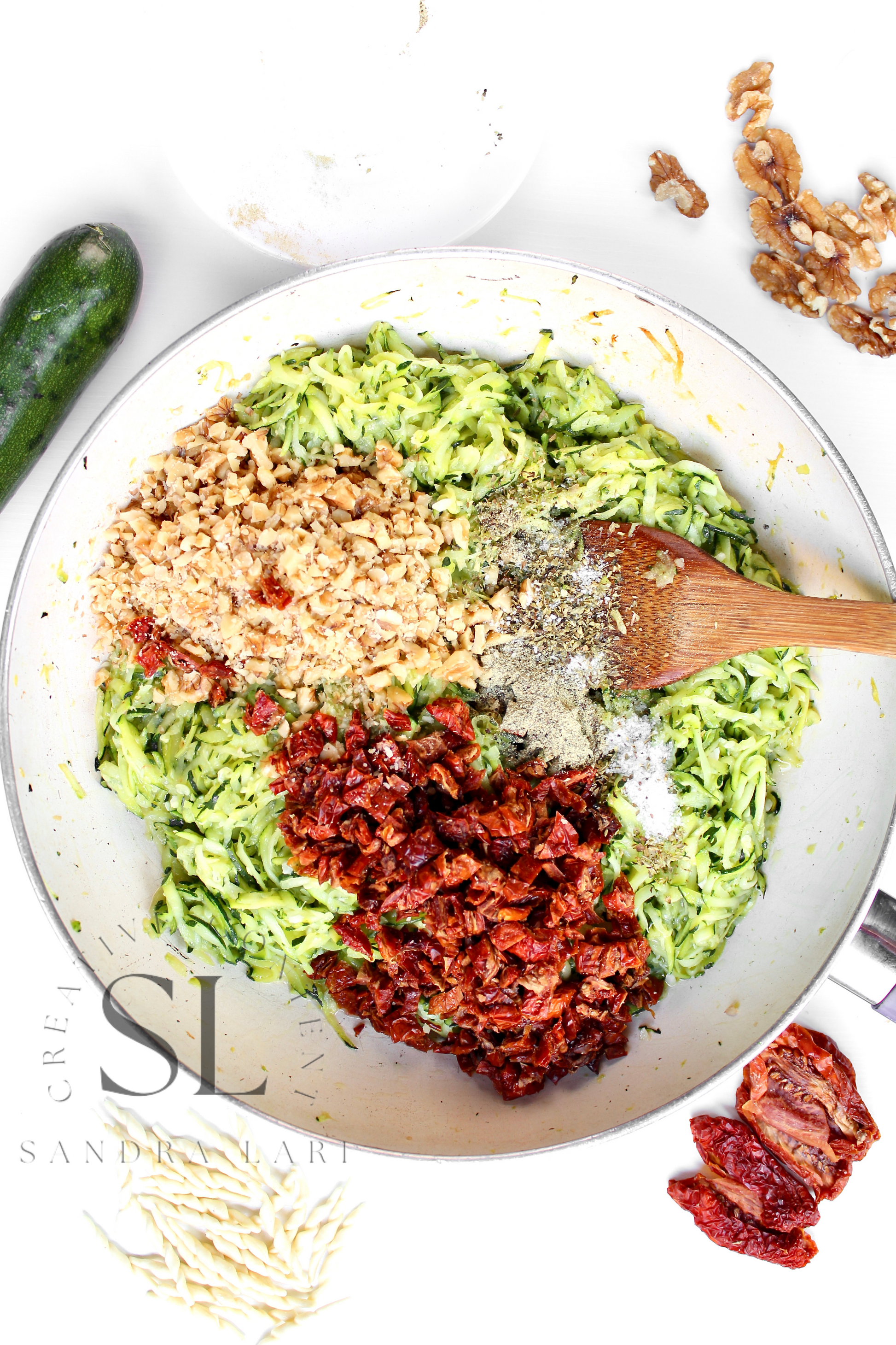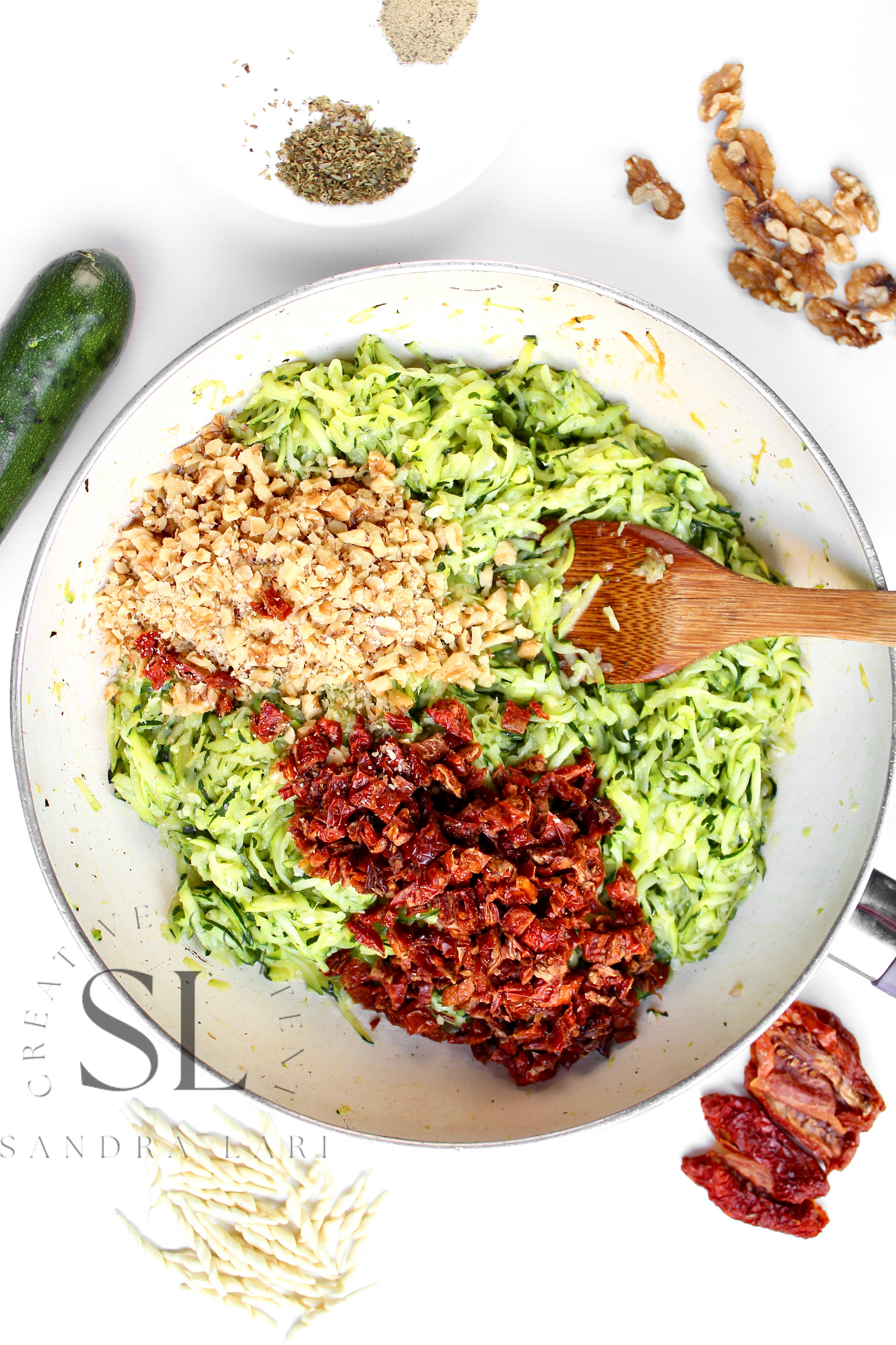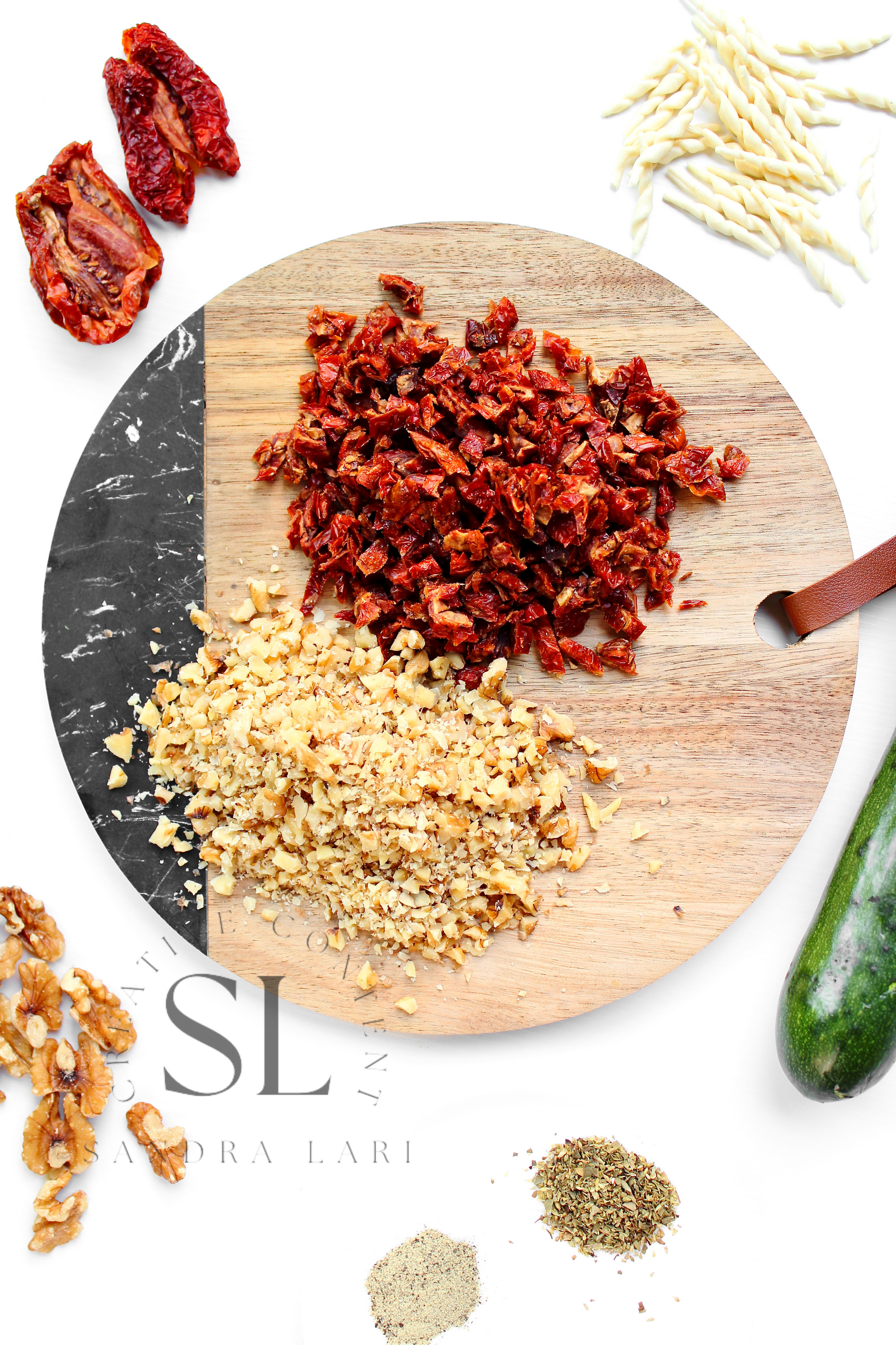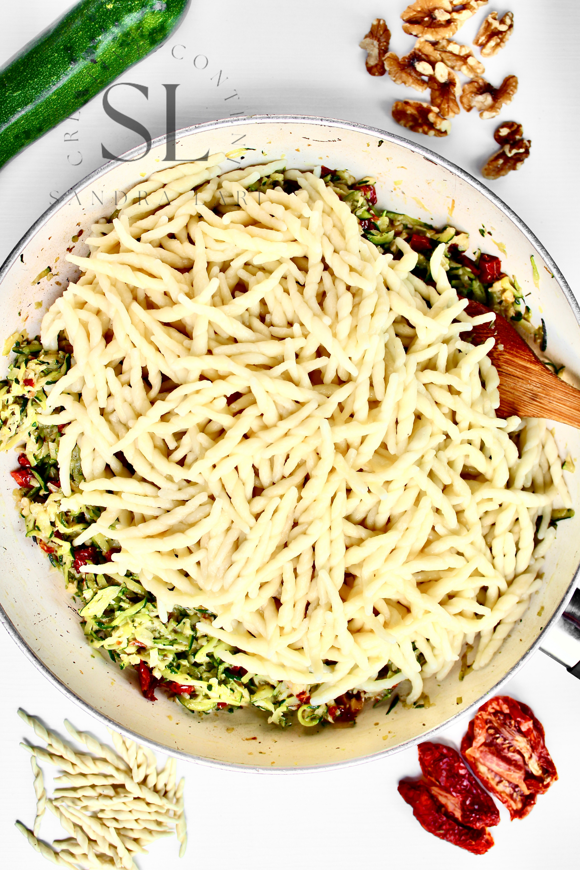 Featured Ingredients: dry pasta, dry tomatoes, zucchini, garlic cloves, walnuts, olive oil, salt and black pepper (+ optional: oregano).