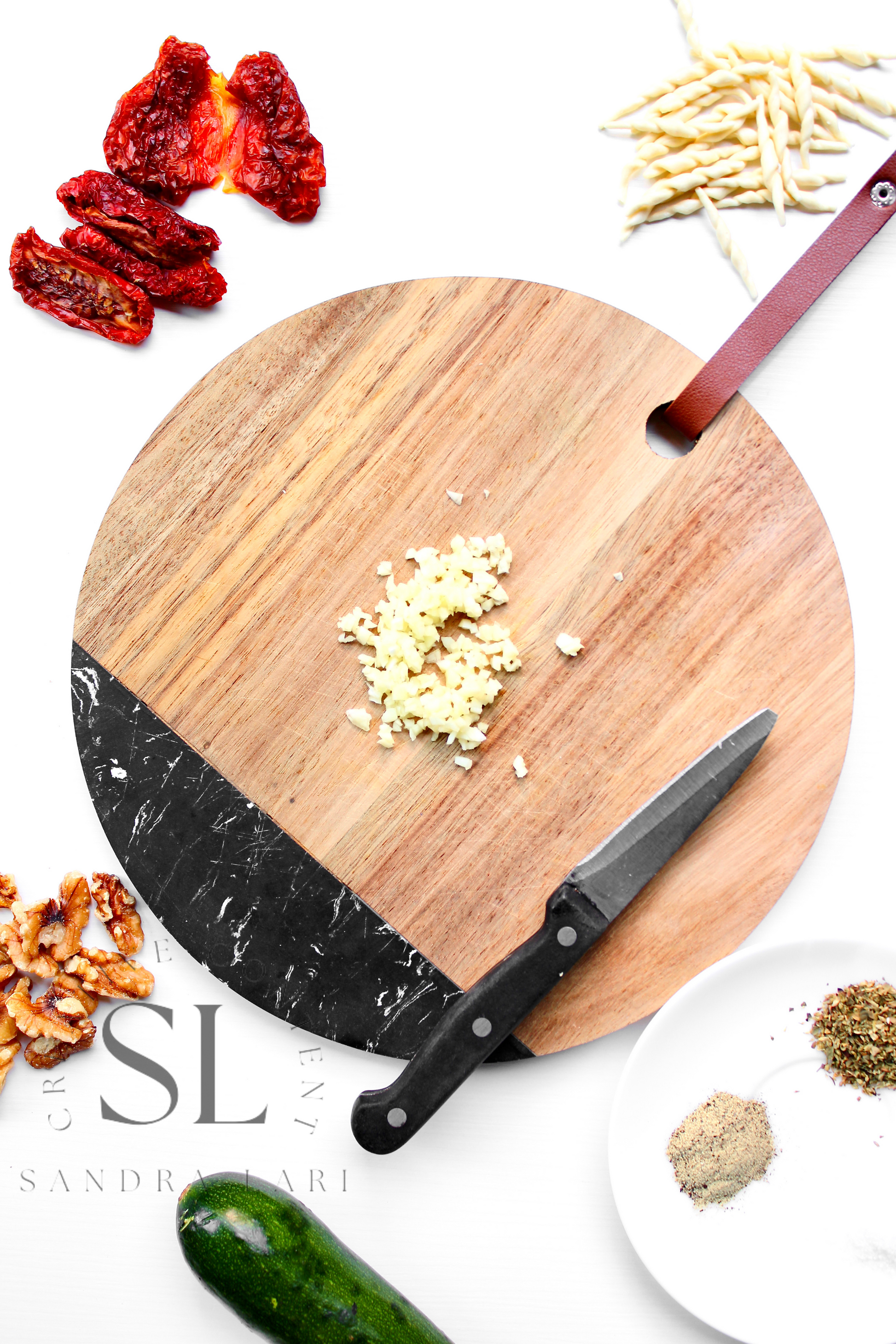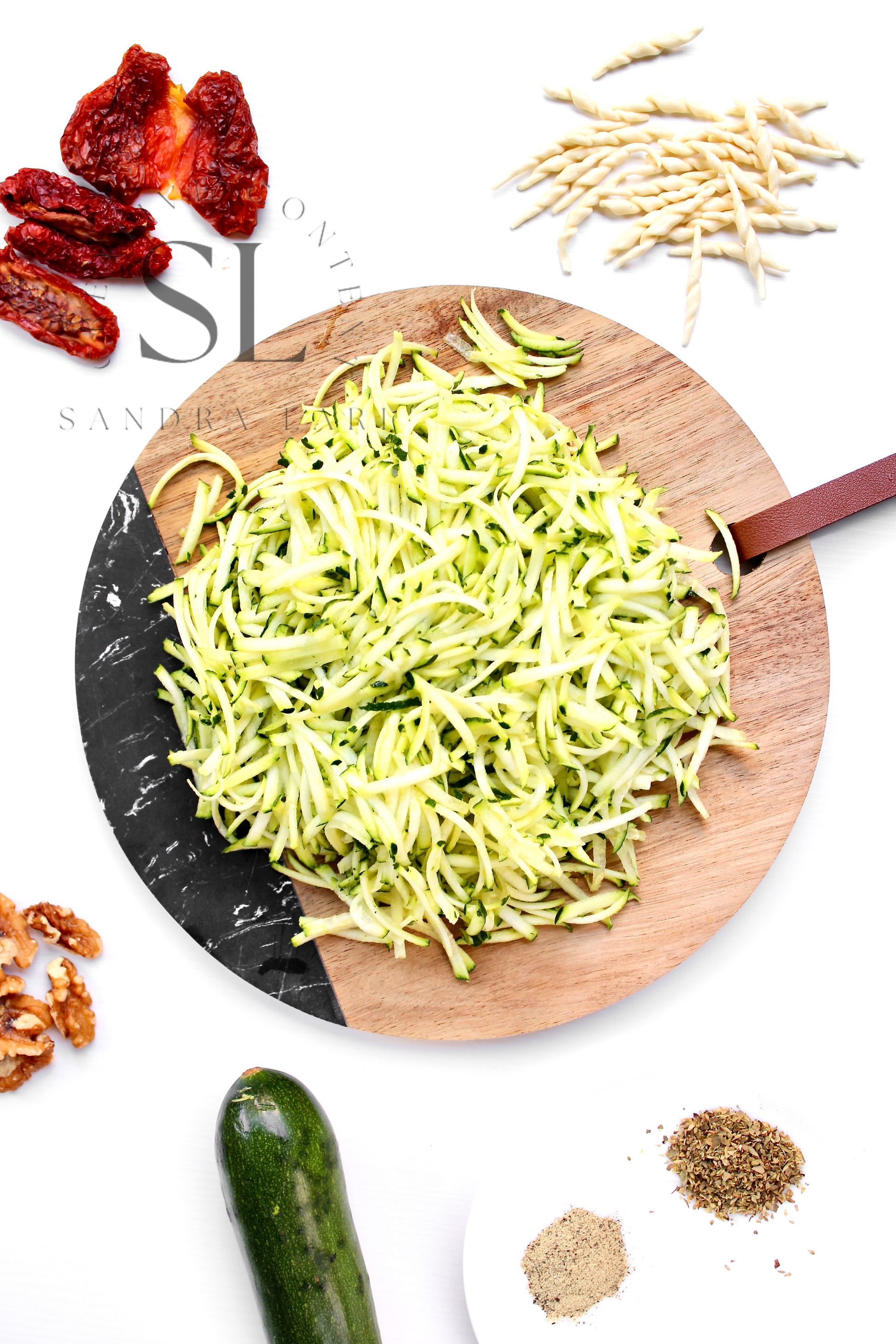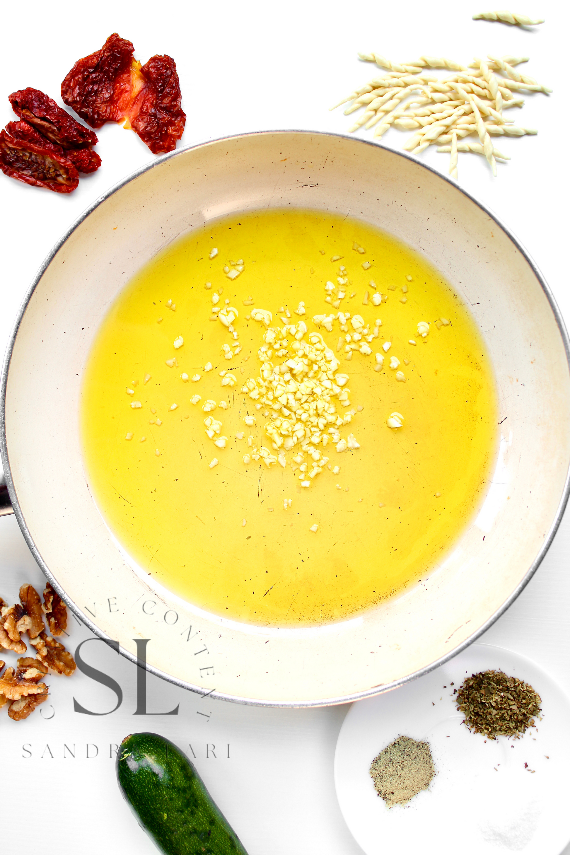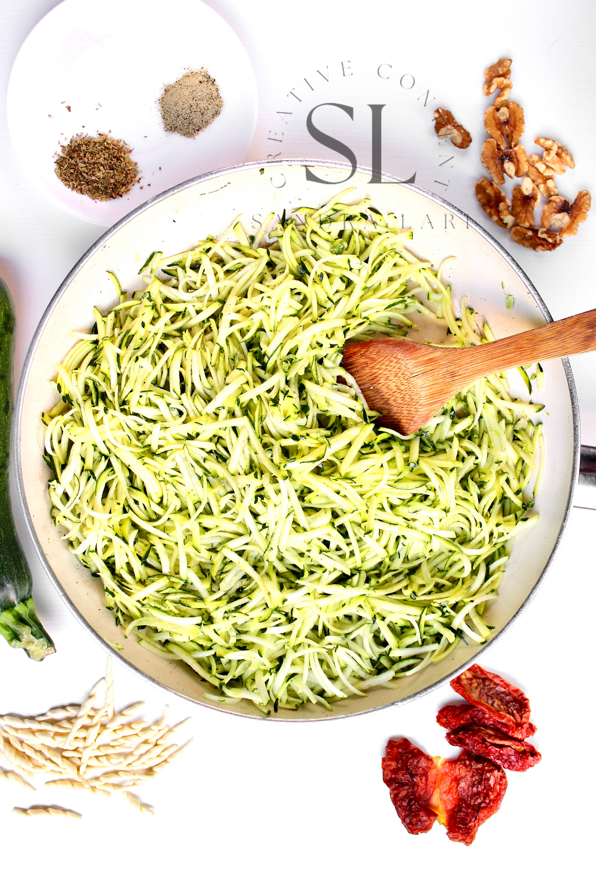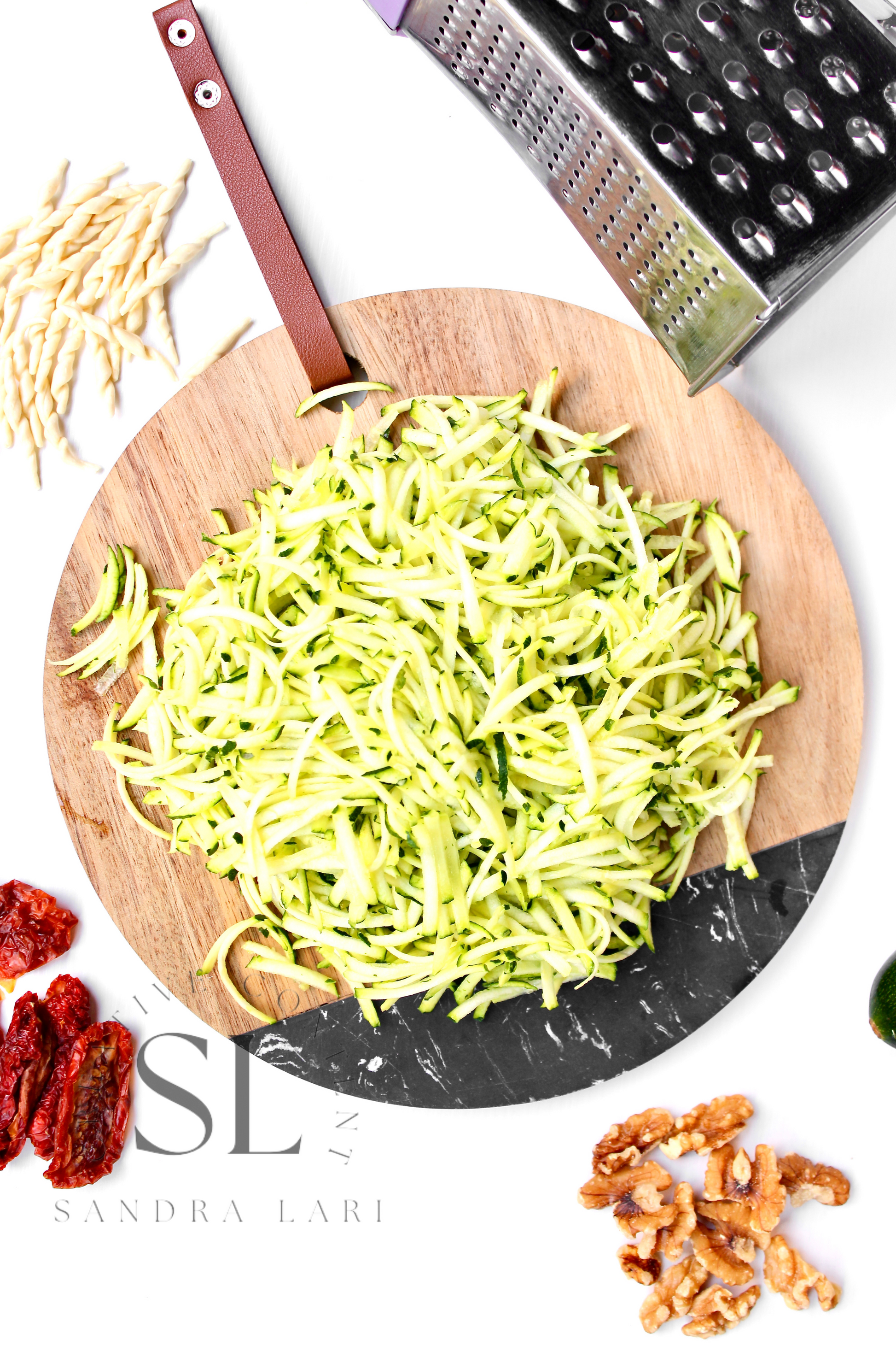 Featured Ingredients: dry pasta, dry tomatoes, zucchini, garlic cloves, walnuts, olive oil, salt and black pepper (+ optional: oregano).